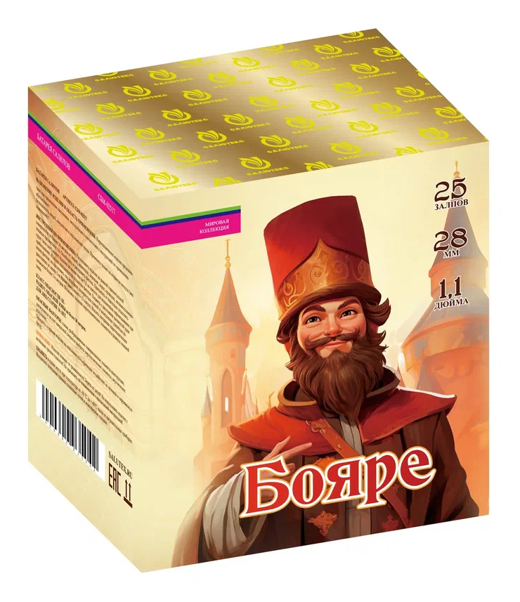 Описание: «Бояре» воссоздает атмосферу старинных русских дворцов и балов. Ее залпы словно переносят зрителей во времена величия и благородства, где каждый световой узор напоминает о пышных платьях и танцах при дворе. Эта батарея салютов отлично подходит для мероприятий с исторической тематикой или для праздников, где ценится элегантность и великолепие.