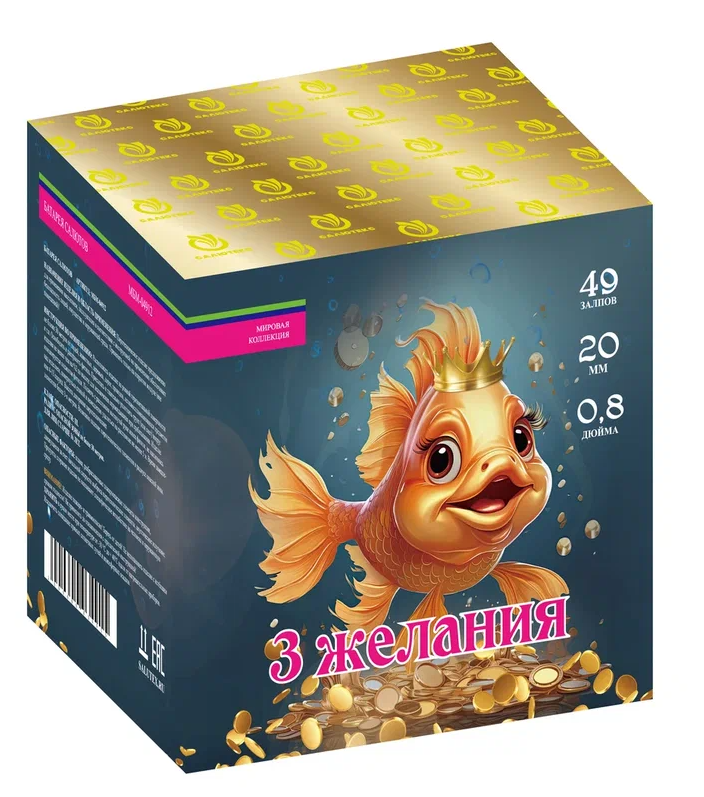 Описание: «Три желания» создает ощущение волшебства и загадочности. Каждый залп этой батареи салютов словно исполняет одно из загаданных желаний, озаряя небо яркими и многогранными цветами. Эта батарея идеальна для вечеров, где хочется создать атмосферу чуда и волшебства.